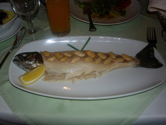 Faites bouillir une petite bassine de crème fraîche avec une table de citron, du sel et du poivre au goût et un petit centimètre de sucre.Laissez remuer VIGOUREMENT en permanence! Ajoutez une c. À thé d’amandes en poudre, d’aneth finement haché, de flocons d’amandes grillées, du sel et du poivre au goût.Fermez sur l’assiette avec une cuillère de service, déposez la truite sur le dessus, puis versez un peu plus sur le côté recouvert d’amande.Servez IMMÉDIATEMENT.