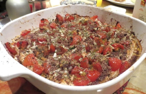 Recouvrir d'une couche de tomates, puis l'oignon et le persil.
