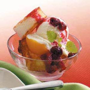 Placez les tranches de gâteau dans des bols individuels; placez une moitié de pêche, côté coupé vers le haut, dans chaque trou.Saufilez une cuillère de yogourt glacé et des découpes de gâteaux réservées.Assumez du mélange à la framboise.Servez immédiatement