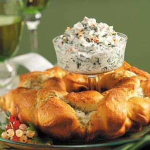 C'est l'apéritif préféré de ma fille. Au lieu de servir une trempette aux épinards avec des cubes de pain ordinaires, vous préparez des biscuits réfrigérés pour former un délicieux anneau de pain. - Sandra Conti, Agawam, Massachusetts