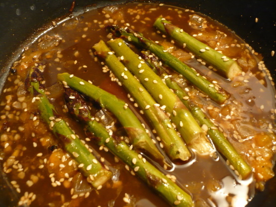 Faites cuire à feu moyen-doux jusqu'à ce que les asperges changent de couleur et soient tendres, environ 8-10 minutes.