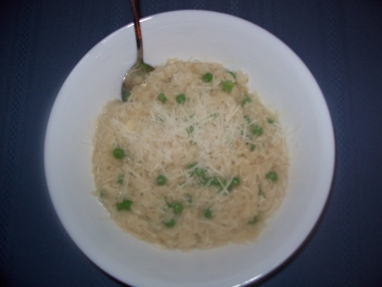 Dans la cocotte, faire chauffer 2 cuillères à soupe de beurre à feu moyen .Faire sauter l'oignon pendant 4 à 5 minutes jusqu'à ce qu'il soit tendre. Remuer fréquemment pour que l'oignon ne brunisse pas.Ajouter le riz et faire sauter jusqu'à ce qu'il soit brun clair.Ajouter les pois et le bouillon de poulet. et mettre à pression.Baisser le feu et laisser cuire pendant le temps suggéré.Voir les heures ci-dessous.Relâchez la pression et ouvrez le couvercle.Ajoutez une cuillère à soupe supplémentaire de beurre, parmesan et poivre.Laissez reposer jusqu'à ce que le beurre et le fromage soient fondus.Rassez bien et servez.