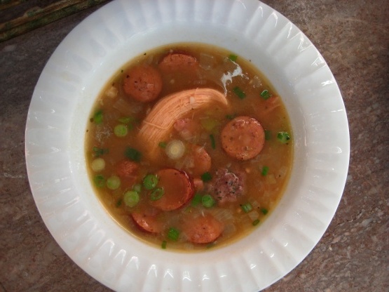 180 minGombopoule, saucisse, jambon, onion, céleri, gousses d'ail, paprika, pétrole, farine, eau, sel, poivre, persil, onion, du boeuf, onion, persil, sel, poivre,avumelles gumbo poulet et saucisse