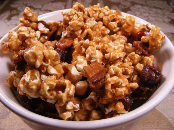 Dans une très grande casserole ou un grand bol, verser le sirop au caramel sur le maïs soufflé.