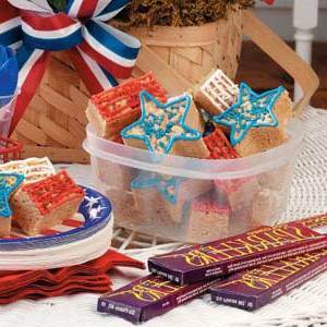 Divisez le plateau de barres en deux. En une moitié, découpez les étoiles à l'aide d'un emporte-pièce en forme d'étoile de 2,5 po graissé. Coupez la moitié restante en barres de 3,25 x 3,35 po pour les rayures.