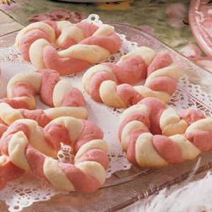 Pour chaque biscuit, façonnez une boule de 1 pouce de chaque couleur en une corde de 8 pouces. Placez une corde rose et blanche côte à côte; presser délicatement ensemble et tordre.Placez 2 po.appuyez sur des plaques à pâtisserie non graissées; former dans un coeur et centimètre se termine pour sceller