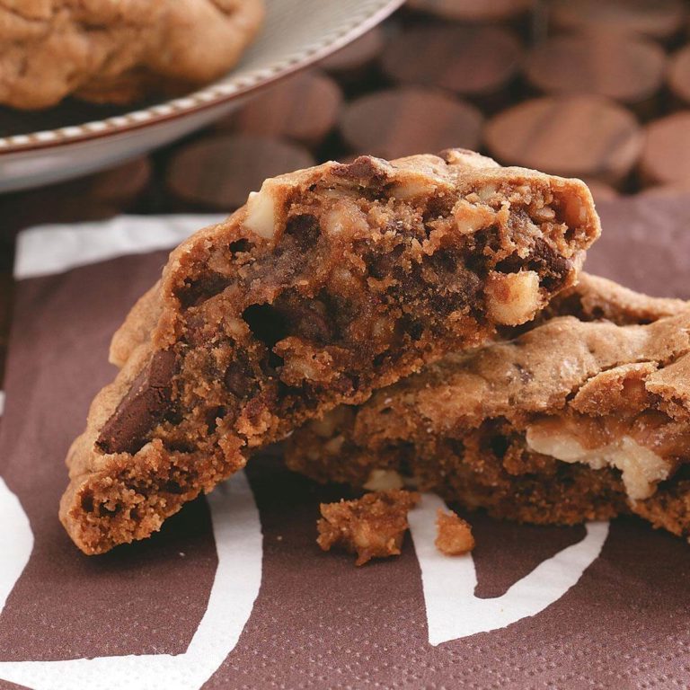 Mélanger la farine, le bicarbonate de soude et le sel; ajouter au mélange en crème en alternance avec le mélange de café réservé, en battant bien après chaque addition. Incorporer les morceaux de chocolat et les noix si désiré. Couvrir et mettre au réfrigérateur pendant 30 minutes.