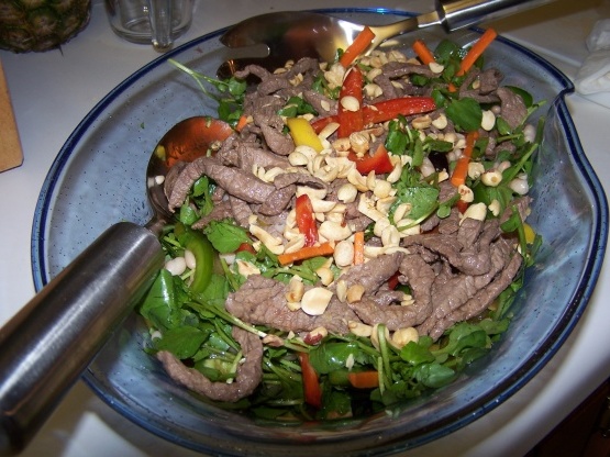 Déposer le bœuf sauté sur le dessus de la salade. Arroser de vinaigrette et parsemer d'arachides.