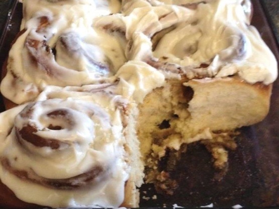 Une fois que la pâte a doublé de volume (environ une heure), rabattez-la et placez-la sur votre surface de travail légèrement farinée.Faites rouler la pâte dans un carré d'environ 2/3 à 0,75 cm d'épaisseur.Étale restante beurre sur la pâte et saupoudrer de sucre et de cannelle.Roulez la pâte étroitement et doucement au centimètre ensemble. Avec un couteau tranchant, j'ai utilisé une lame dentelée, couper les bords et couper le journal en huit morceaux égaux.Placez les rouleaux coupés dans Couvrez et laissez lever environ 45 minutes jusqu'à ce qu'ils n'aient pas tout à fait doublé de taille. Préparez votre four à 375 ° C et laissez cuire pendant environ trente-cinq minutes jusqu'à ce qu'il soit doré (jusqu'à ce qu'un thermomètre à lecture instantanée indique 190 à 200) .Retirer du four et laisser refroidir environ vingt minutes et le gel.