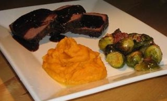 Buffalo rôti glacé à l'orange avec choux de Bruxelles rôtis à l'ail