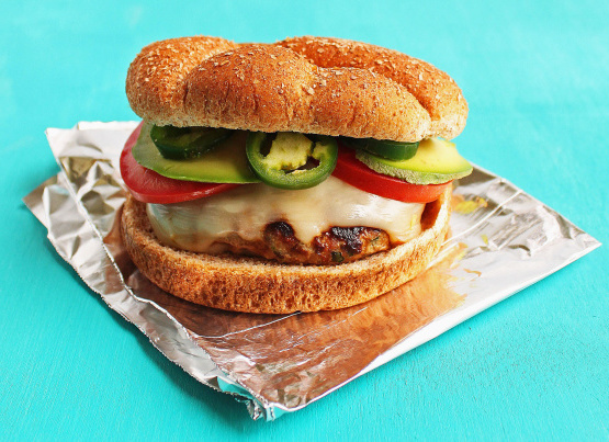 Faites et partagez cette recette de burgers à la coriandre à la dinde, au fromage Pepper Jack et à l’avocat de.