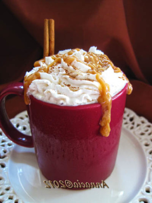 Recouvrez de crème fouettée parfumée, versez un peu de sauce au caramel sur la crème et ajoutez un bâtonnet de cannelle.