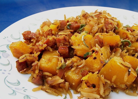 Casserole de courge musquée, riz et saucisses