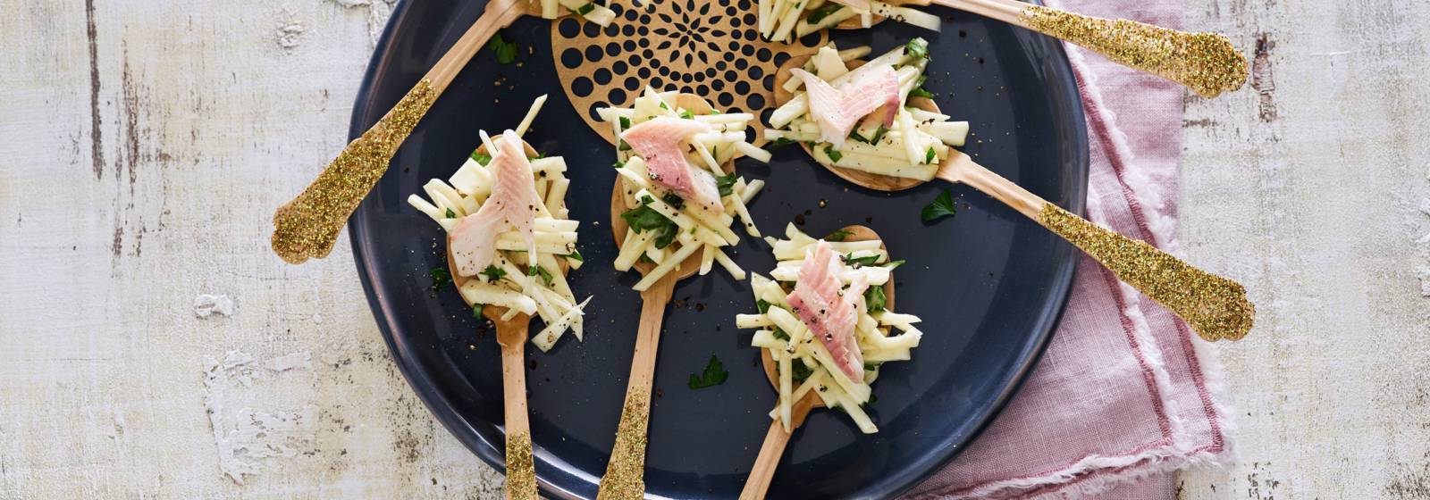 Couper le céleri rave en fines lanières (julienne). Mélanger dans un bol avec la mayonnaise, le jus de citron et le persil. Couvrir et mettre au réfrigérateur pendant 30 minutes. Répartir la remoulade sur les 10 cuillères, déposer un filet de truite et servir immédiatement.