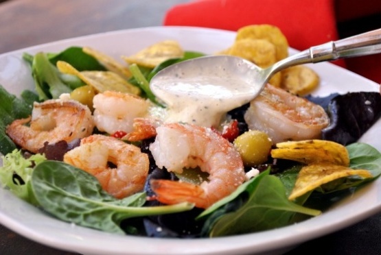 Place the lettuce in a large bowl. Add the dressing, toss to coat, and divide the greens among your plates. Sprinkle each serving with some plantain chips, olives and cheese. Top with the shrimp and serve immediately!