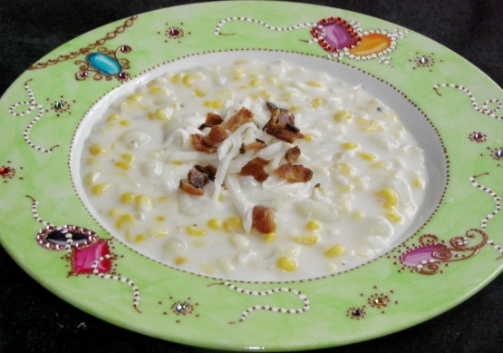 En lisant un certain nombre de recettes de soupes en ligne un jour, je suis tombé sur celle-ci et je me suis rendu compte que j’avais tous les ingrédients sous la main. Comme il faisait très mauvais dehors, j’en ai fouetté une fournée dans l’espoir de dégeler ma colocataire une fois rentrée chez elle. Elle adorait ça et tous les autres pour qui je l'avais faite.Il ne m'a jamais semblé qu'il y avait assez d'eau pour faire cuire les pommes de terre, le maïs et l'oignon, mais croyez-moi, il y en a! Délicieux avec du bacon ou du jambon et du cheddar, si désiré.