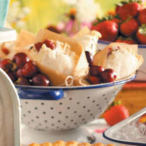Divisez la pâte en huit portions.Sur une surface légèrement farinée, étalez chaque portion dans un cercle de 5 po.Placez environ 3 cuillères à soupe de mélange de cerises sur un côté de chaque cercle; replier la pâte sur la garniture.Appuyer sur les bords avec une fourchette pour bien sceller.