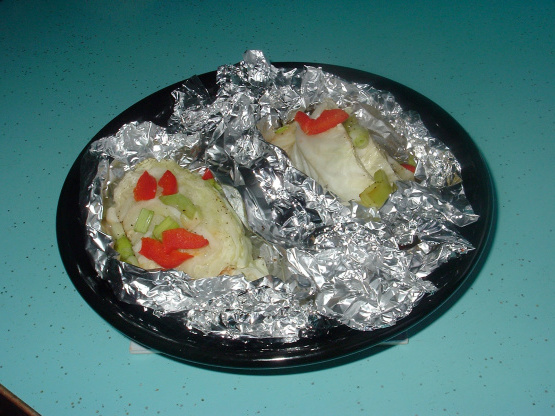 Fold foil into "packet" by folding sides in first, then rolling ends ( be sure there is no way the butter can drip out ) Cook on grill ( charcoal or gas, but charcoal tastes best ) on medium heat for about 30 minutes.The mixture is done when cabbage and other ingredients are tender!