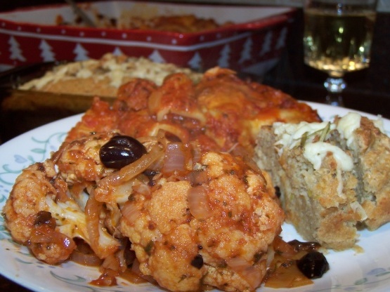 Cette recette inhabituelle de chou-fleur provient du livre de recettes grecque Cooking de 1995. Les olives vertes peuvent remplacer les noires, si désiré.