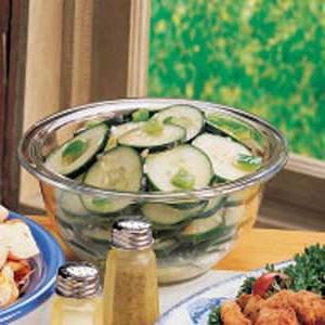 Ces concombres sont incroyablement faciles. Je viens d'ajouter des piments verts et des oignons émincés de notre jardin et de nos vinaigrettes en bouteille. — Charlotte Baillargeon, Hinsdale, Massachusetts