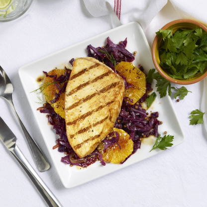 Faites et partagez cette recette Escalopes de dinde au chou rouge et oranges à la poêle.