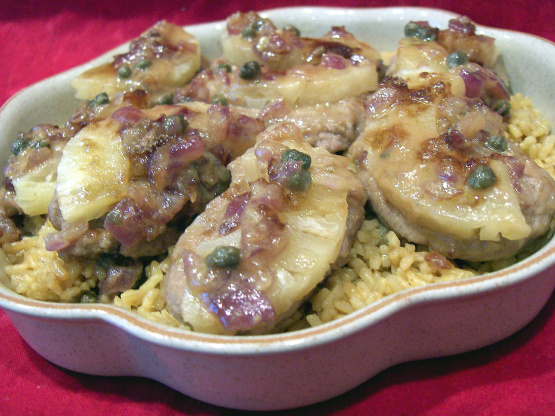 105 minAnanascôtelettes de longe de porc, sel, poivre, jus de câpres, jus de câpres, moutarde, sucre, jus d'ananas réserve, onion, pétrole,côtelettes de longe de porc juteuses -
