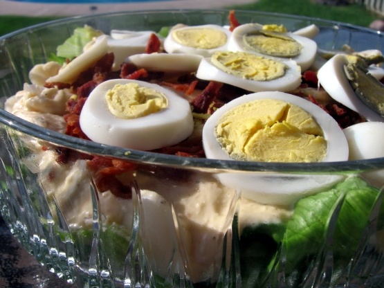 Une salade en couches délicieuse et attrayante.Le céleri et les châtaignes d'eau donnent un joli croquant, et la vinaigrette au parmesan fraîche avec garniture au bacon / œuf ajoute une saveur merveilleuse aux légumes.Il est important que chaque portion comprenne une portion de toutes les couches.Veuillez noter : le temps de réfrigération pendant la nuit est essentiel pour la saveur, et en fait un bon plat à préparer.Cette recette serait parfaite pour un déjeuner de dames dans la région sud des États-Unis.