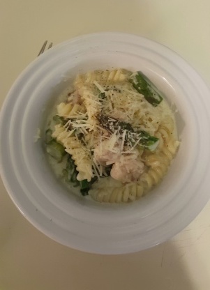 Égoutter les pâtes et mélanger avec la sauce et le mélange crevettes/asperges. Saupoudrer de parmesan au moment de servir