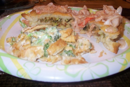 Dans une casserole en verre préparée (pulvérisée) de 13 x 9, placez 1 feuille de pâte de croissant au fond de la casserole.Mélange à farce en couche puis placez une autre feuille de croissant sur la couche de farce.Si vous ne disposez pas de feuilles de croissant, remplacez le croissant normal. rouler la pâte non coupée. Une option ici serait de farcir le mélange en rouleaux de croissant et de rouler comme d'habitude pour des portions individuelles.