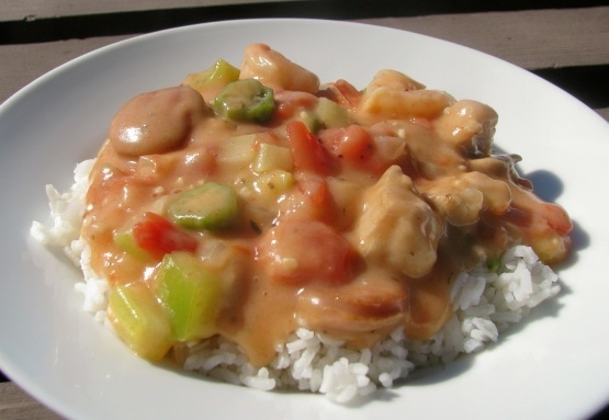 80 minGombofarine, sel, poulet en, pétrole, onion, céleri, onion, gousses d'ail, bouillon, tomates, baie, marque de sauce au poivre, gombo, riz,gumbo poulet louisiana -