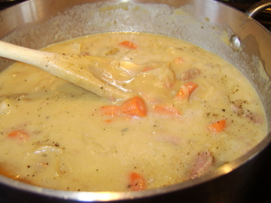 Ajoutez l'autre moitié du mélange préchauffé de chou et d'oignon aux cubes de carotte, de pomme de terre et de porc fumé (ou au jambon si vous les utilisez). Amenez la soupe à ébullition douce, réduisez le feu et laissez mijoter pendant 6 à 8 minutes. .