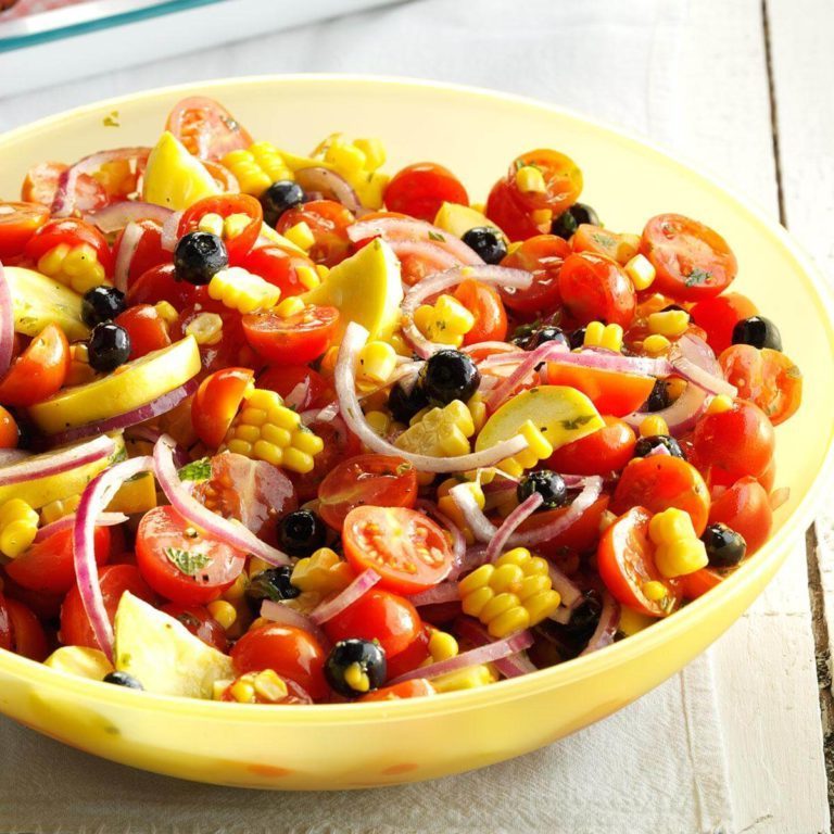 Ma folle salade contient des tomates cerises, de la courge et des bleuets dans un seul bol.Ensuite, je me couche sur la saveur avec du maïs frais, de l'oignon rouge et de la menthe. — Thomas Faglon, Somerset, New Jersey
