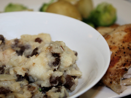 Une farce au poulet légèrement sucrée et légèrement salée que j'ai inventé pour utiliser des aliments que j'avais autour de moi. Je n'avais pas d'oeufs que j'avais l'habitude de ficeler, mais je le soupçonnais au moment de la cuisson et de la disparition de certains Cela ne fait pas beaucoup de différence, et cela s’est avéré formidable. C’est suffisant pour faire un petit poulet (disons 1,5 kg ou moins), doubler la quantité d’un poulet volumineux.