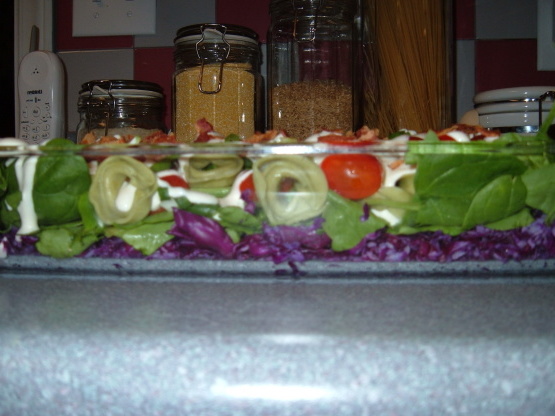 Couche dans un plat allant au four 13x9: chou, épinards, tortellinis, tomates et oignons verts.