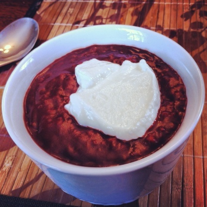 Dans une casserole, faites bouillir l'avoine et l'eau avec la moitié du jus de betterave. Réduisez la chaleur. Dans un mélangeur, combinez la banane, le reste du jus de betterave, le cacao, la caroube, les dattes, la vanille et le babeurre.