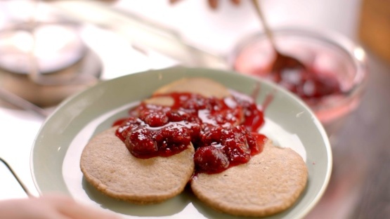 Servir immédiatement - l'avoine continue à boire, et les crêpes sèchent au repos - avec le miel chaud à la framboise versé sur le dessus.