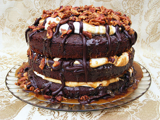 Place first layer on cake plate.Plop 0.33 of the whipped cream onto cake.Drizzle caramel and chocolate over cream.Repeat for next 2 layers, but be a little "artistic" with the top layer-oozing the caramel and chocolate over the sides of the cake.Sprinkle liberally with pecans!