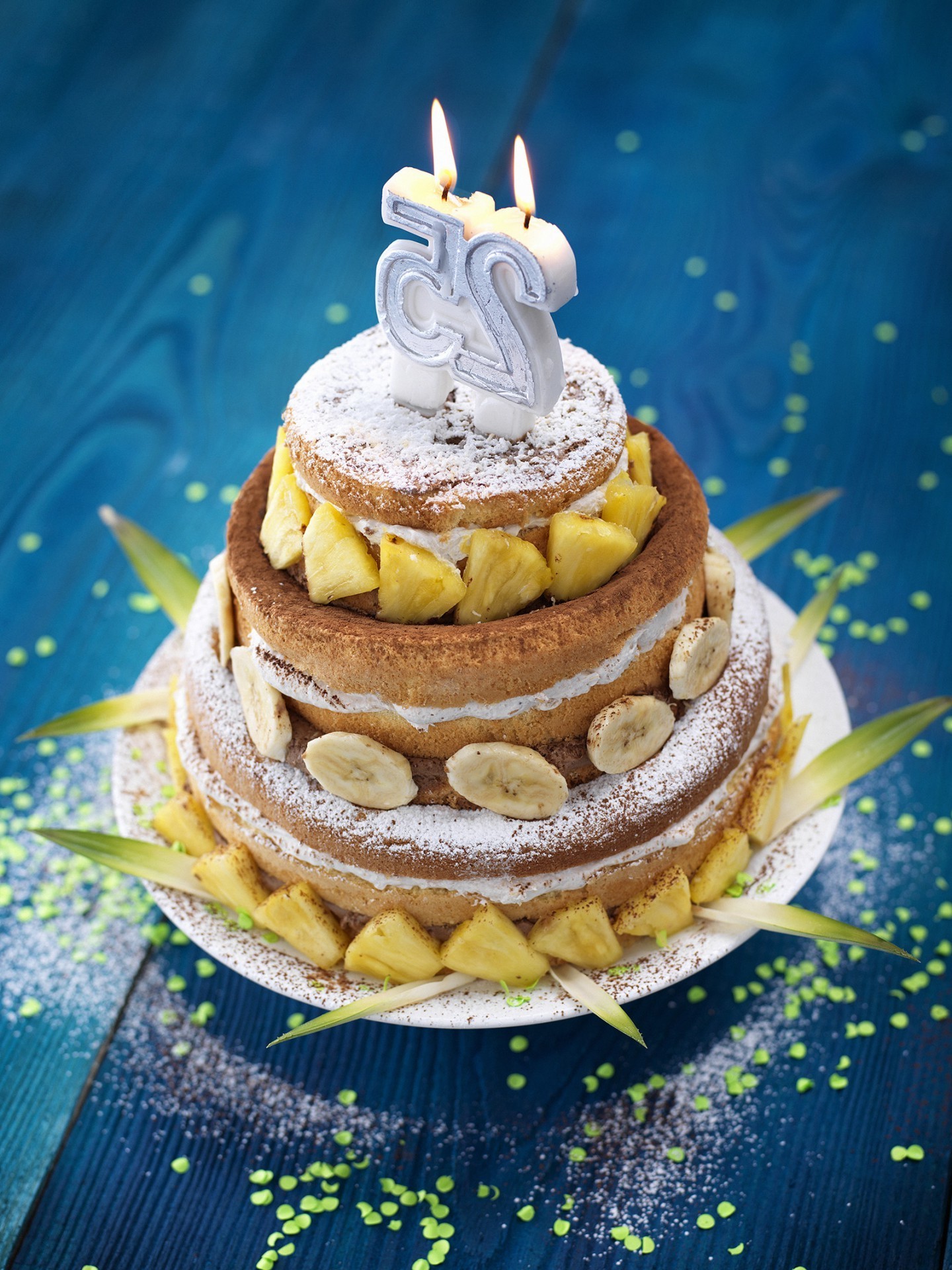 Couper la banane et l'ananas, tirer les feuilles de la couronne d'ananas et décorer le gâteau.