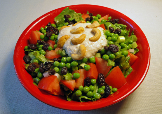 POUR LA SALADE ~ Dans un bol à salade, mélanger les légumes verts, les tomates, les pois, les raisins secs et les oignons verts.
