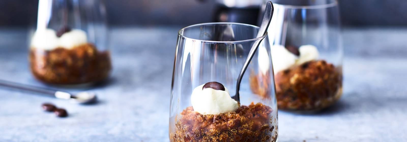 Granité de café fort au whisky, au sucre en poudre brun, à la crème fouettée et aux fèves de moka.