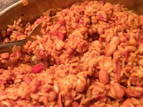 Put the rice mixture into a bowl and stir in the drained beans and chorizo. Enjoy!