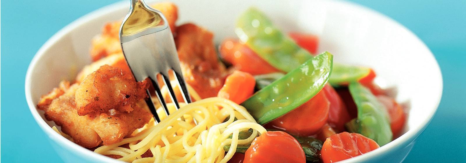 Une belle recette chinoise. Le plat principal contient les ingrédients suivants: poisson, pois mange-tout, huile de tournesol, plat de légumes aigre-doux chinois (615 g), kibbeling (frit, 225 g) et nouilles aux œufs chinois (250 g).