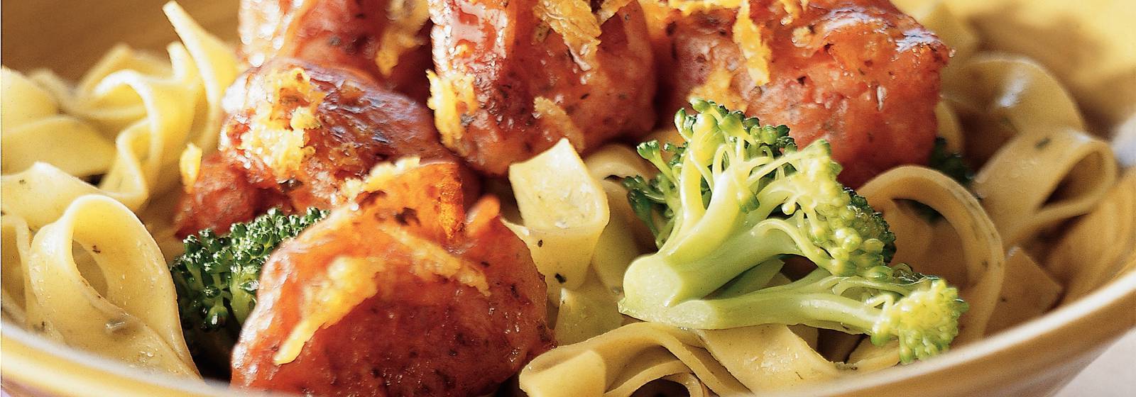 Une recette savoureuse. Le plat principal contient les ingrédients suivants: poisson, bouquets de brocoli (300 g), tagliatelles fraîches d'erbe (250 g), beurre salé, citron et kibbeling italien (environ 200 g).