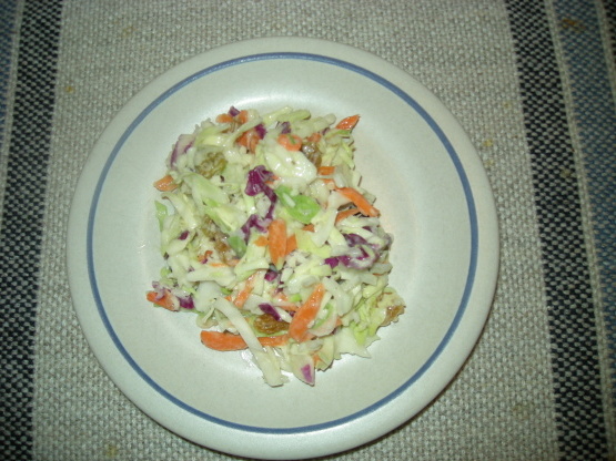 Dans un grand bol, ajoutez le mélange de salade de chou, la vinaigrette et les raisins secs, puis mélangez délicatement jusqu'à ce que le mélange de salade de chou soit uniformément enrobé de la vinaigrette. Laissez reposer au réfrigérateur environ 30 minutes, puis servez.