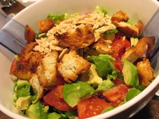 Avant de servir, ajoutez la vinaigrette à la salade ainsi que les croûtons et les amandes grillées.