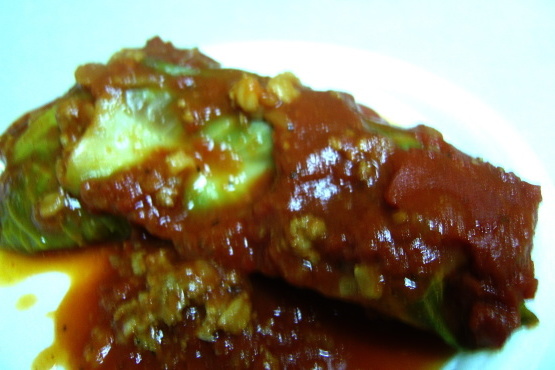 Prenez environ 2 cuillères à soupe de mélange de viande et placez-les sur le rouleau de chou. Replier les côtés sur la viande, puis rouler en rouleau.Placez les rouleaux côte à côte dans un plat allant au four de 9 x 13 ". Continuez à rouler les feuilles jusqu'à ce que le mélange soit parti.