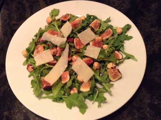 Mélangez la vinaigrette avec la salade à votre goût et mélangez bien - Garnissez de tranches de figues fraîches et de fromage Manchego/noisettes.