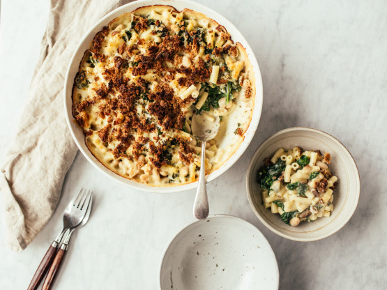 Macaronis et fromage cuits au four avec chou frisé et fèves nordiques