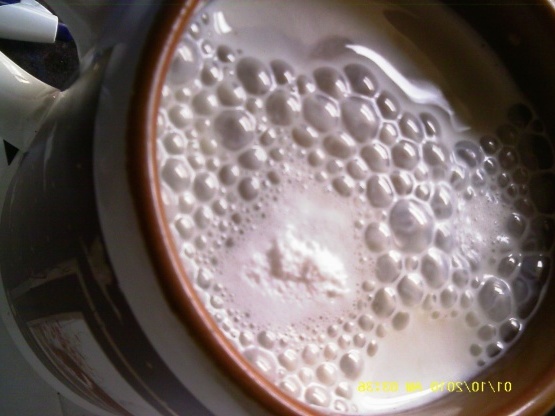Un bol d'une capacité de1/4 litre contenant du lait d'amande non sucré, cuit à la vapeur et mousseux avec de la mousse (ou du lait non laitier au choix)