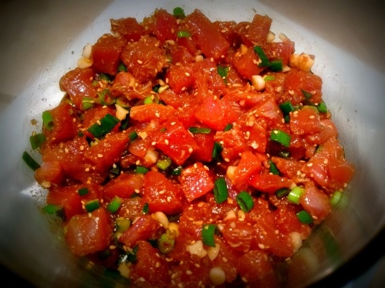 Cela m'est venu après avoir essayé le Poke local que je pensais avoir un peu de piazaz. Un must, c'est l'Ahi le plus frais que vous puissiez trouver. Gelé fonctionnera mais j'ajouterais 2 tbls.de sauce au chili douce.